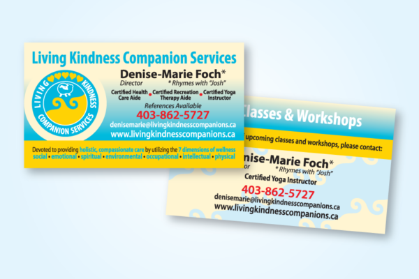 Just Completed: Logo and business card for Living Kindness Companion Services Denise-Marie from Living Kindness Companion Services asked me to design a logo and business card for her new Calgary... read more →